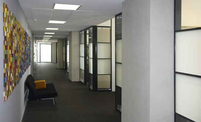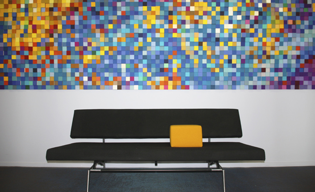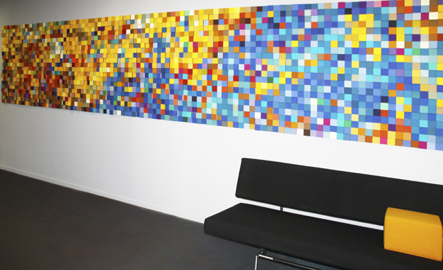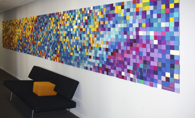 CO-CREATIE: In samenwerking met Paulien en Christiaan van Studio CDB heeft Anne van den Heuvel een waanzinnig Acoustic Couture kunstwerk gerealiseerd in de lengte van de gangzone van één van de kantoren van de Vries en Metman.