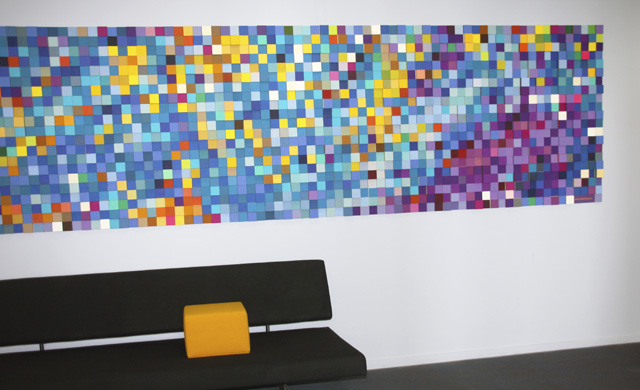 Na goed overleg, waarbij het formaat en de kleurkeuze nauw luisterden ... samen kijken en voelen welke kleuren blauw en geel het best tot z'n recht komen ... tezamen met de reeds gebruikte kleuren van Kvadrat Divina 462, Sikkens UO.10.60 en antraciet ... is het volgende kunstwerk maximaal tot wasdom gekomen.
