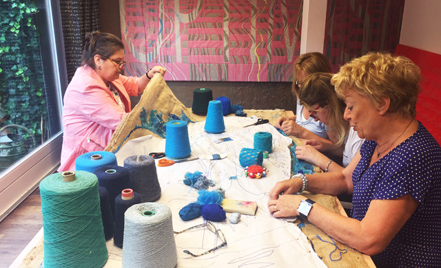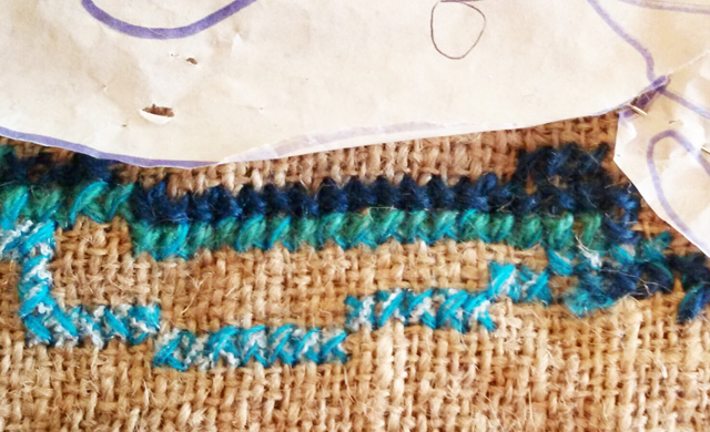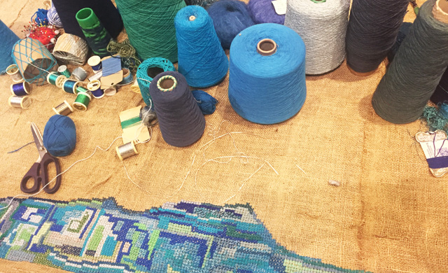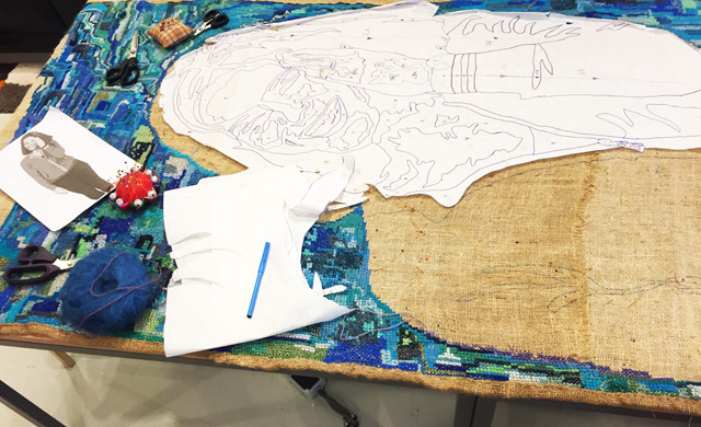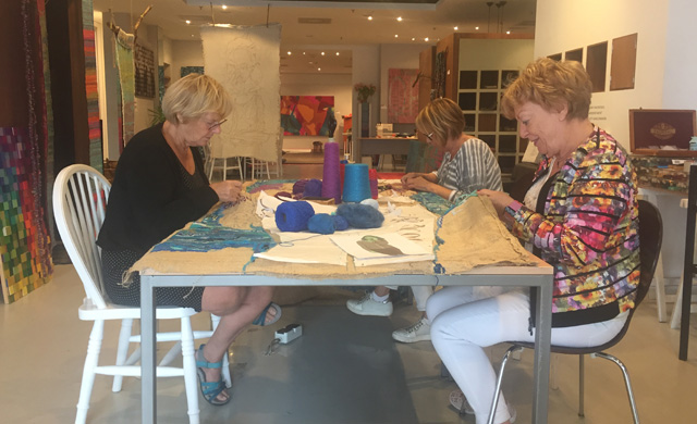 Anny, Marlies, Alice, Maria, Laura, Tugce, Annelies, Lize, Lisa, Anne S., Sanne H., Noa, Wieneke en Ellen hebben zich allereerst maandenlang beziggehouden met alle 'blauwen'. De omgeving van muze Miranda werd blauw in alle tinten en met een overdaad aan turquoise-achtigen. Dat steekt heerlijk af tegen het jute. In deze omgeving kregen de borduursters de opdracht om binnen een bepaald soort vormgeving te borduren waardoor er een organisch grafische structuur ontstaat.