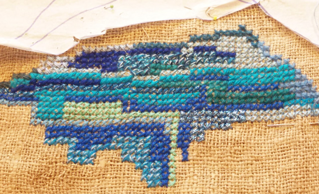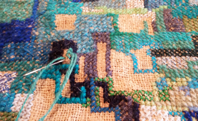 Toen de blauwe omgeving een heel end was, kregen Anny, Alice, Maria, Annelies en Laura de opdracht om het jack van Miranda in te borduren in paarstinten. Pixelachtig en paars. Alle kleuren goed verdelen ... dat is nog gemakkelijker gezegd als gedaan ... en soms was afstand nemen en van plaats verwisselen dan ook de enige manier om het gehele jack in dezelfde tint en structuur te borduren.