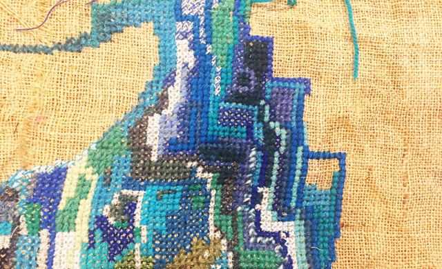 2017 ging het gevoel van Anne uit naar een start van muze Miranda. Zoals ieder begin is dat dan even stoeien, vertrouwen vinden, zoeken, passen en meten en uiteindelijk paste de kruissteek-techniek het beste bij dit project.