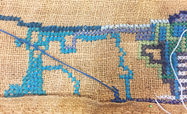 Anne's wens bij alle GESPREKSSTOF projecten is dat deze twee-zijdig zijn te bekijken. Tijdens het borduren is het dus ook belangrijk om je bewust te zijn van de achterkant van het borduursel. Hier hoefde het niet zo strak te zijn als aan de voorzijde maar alles behoort wel strak en vast te zitten. En ook hier was de regel: alles wat niet strak zit, wordt uitgehaald en opnieuw gedaan. Dat lijkt streng ... maar Anne is niet zo onaardig, ze weet gewoonweg precies wat ze wil en heeft een bepaald idee voor ogen hoe ze het graag ziet.