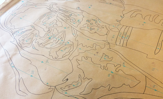 Sanne H. kreeg op een bepaald moment de taak om het gehele patroon van Miranda los te knippen en over te nemen op het jute. Eem fix klusje, zo bleek ... want daar was zijn zomaar niet klaar mee. De tekening moest er namelijk zeer duidelijk op staan zodat de borduursters zich niet zouden gaan vergissen. Soms gaf dat mooie taferelen van een zittende Sanne bovenop het werk, terwijl de anderen om haar heen verder borduurden.
