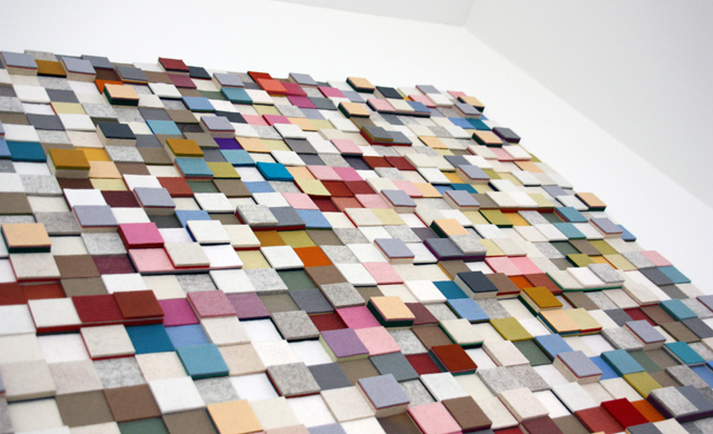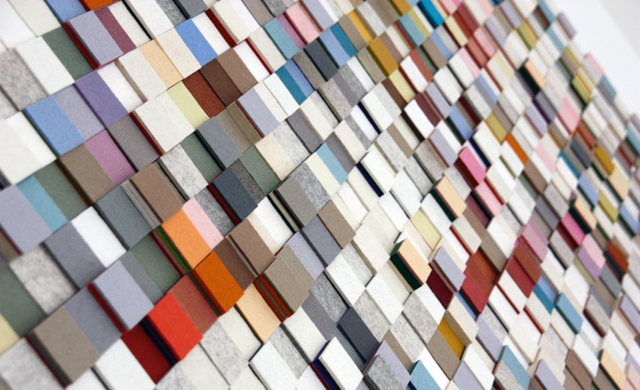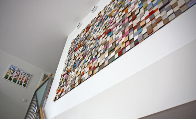 Elke dag kijken wij met plezier omhoog. Daar op de wand boven de trap hangt het kunstwerk dat Anne van den Heuvel voor ons maakte en ter plaatse op de muur bevestigde. Het is een Acoustic Couture, zoals Anne dat noemt. Een mooi woord voor een uit vilten vierkantjes van 5 x 5 cm samengesteld wandkleed. Alhoewel, het is geen wandkleed in de klassieke betekenis van het woord. De vilten vierkantjes zijn verschillend van dikte en kleur. Het is eigenlijk een viltmozaïek, een viltmozaïek met reliëf.