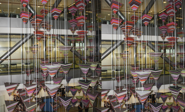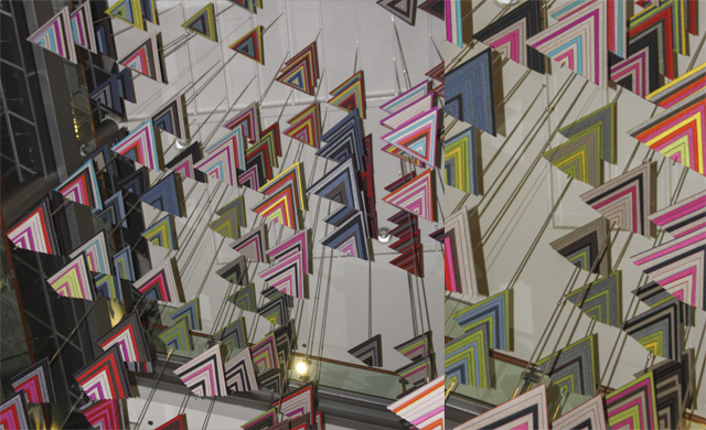 Het reliëf, opgebouwd uit gelijkzijdige driehoeken die samen piramides vormen, geeft een verrassende gelaagdheid in het kunstwerk, die bij elke etage die men betreed weer een compleet ander beeld vormt.