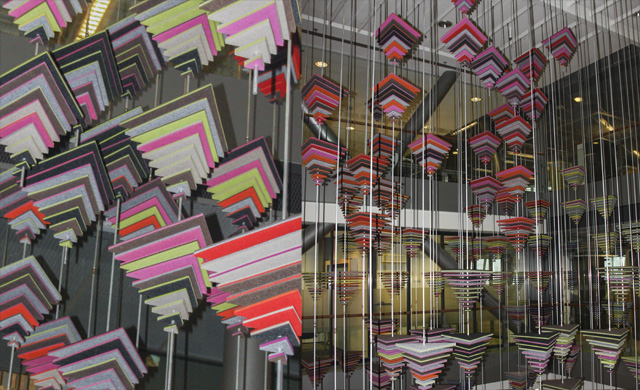 Kunstenares Anne van den Heuvel heeft in opdracht van de gemeente Alphen aan den Rijn een kunstwerk gerealiseerd dat letterlijk alle verdiepingen van de 14 meter hoge vide van de centrale hal in het stadhuis met elkaar verbindt. Het enorme, kleurrijke kunstwerk is gemaakt van gerecycled vilt en verbeeld het thema: ‘samenbundelen van krachten als sterke gemeente in het Groene Hart’.