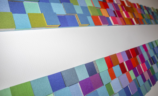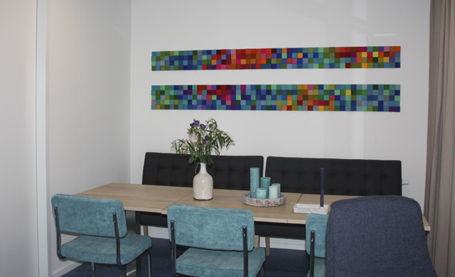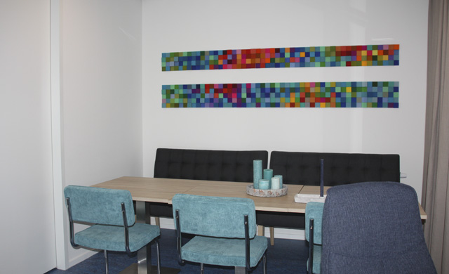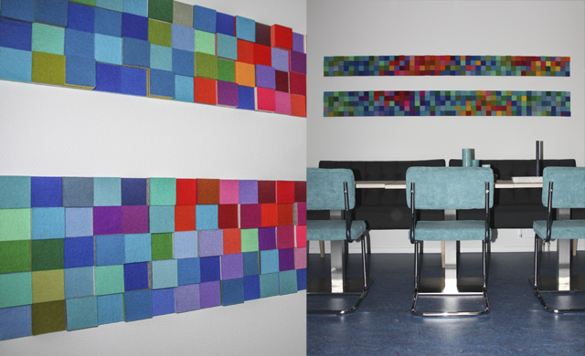 Textiele kunstwerken met geluiddempende werking van textielkunstenares Anne van den Heuvel. De kleurrijke wandkleden worden gemaakt in vilt, op maat en op kleur. De verschillende kleurlagen vormen het reliëf. De monumentale en decoratieve wandtapijten in viltreliëf gaan een geraffineerde relatie aan met het interieur en hebben een gunstige invloed op de akoestiek.