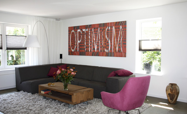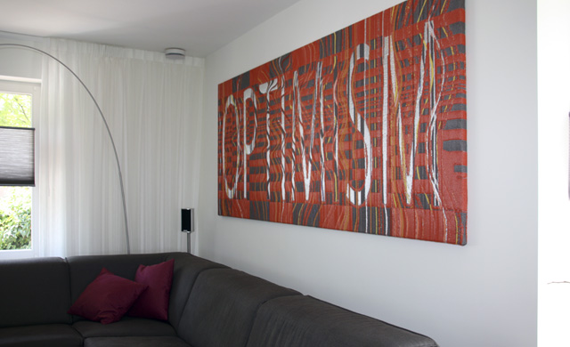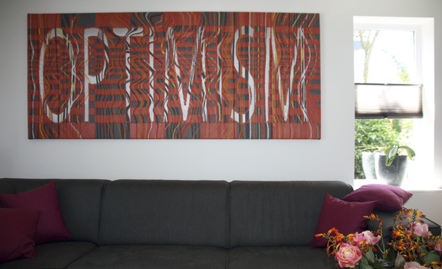 Tijdens een kleurraak consult van Anne op locatie werd duidelijk dat 'OPTIMISM' de blikvanger en moodmaker in de ruimte zou gaan worden. Het kunstwerk zou meteen bij binnenkomst de juiste toon en energie geven ...