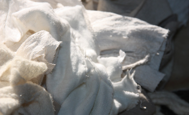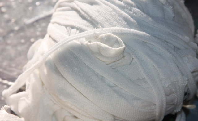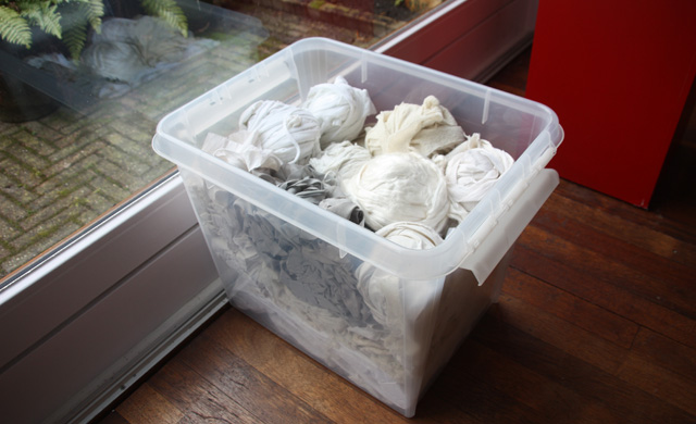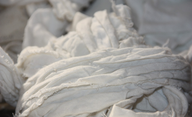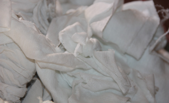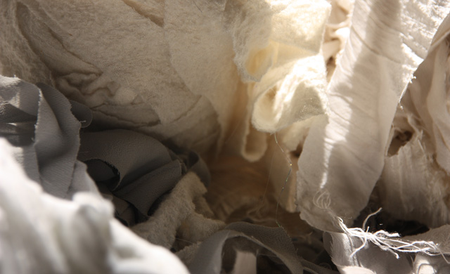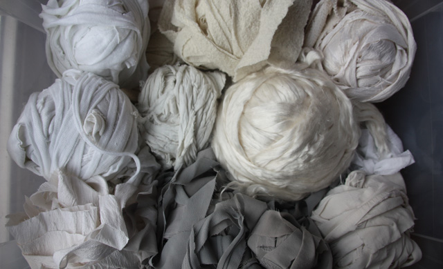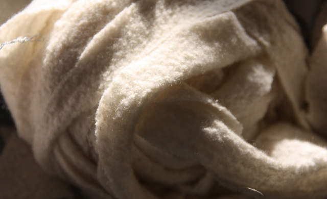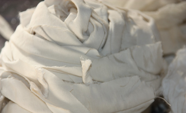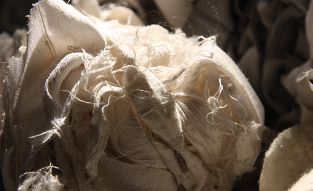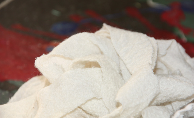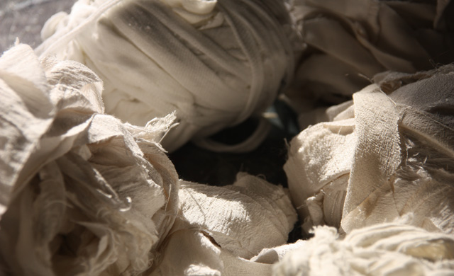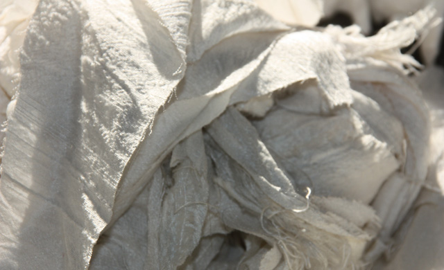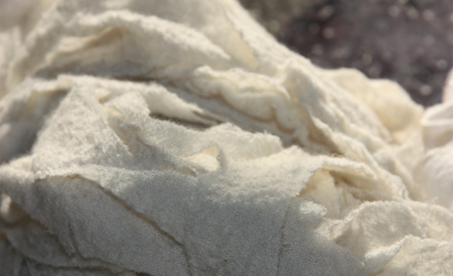 Zijde, Linnen, Katoen, vooral heel veel wol. Want uiteindelijk zou het kunstwerk gerealiseerd gaan worden in voornamelijk wol. Wol gecombineerd met zijde, katoen, linnen en hier en daar en vleugje van wat anders. Alle stoffen werden tot repen verknipt en ook verzamelden we losse wol en pure lontzijde. Alles werd klaar gezet om meters weefsel mee in elkaar te verbinden. Wat we zouden gaan vervilten volgens traditionele Ottomaanse wijze. Het moest met elkaar verweven worden, en stevig ook, een stevige basis voor YuHan.