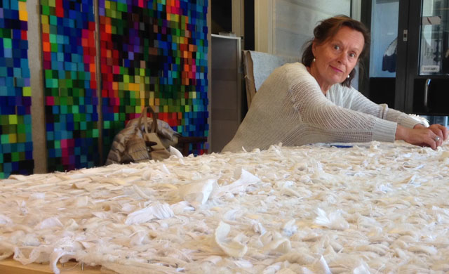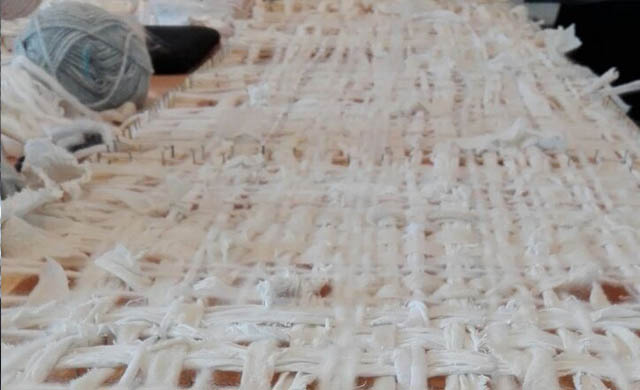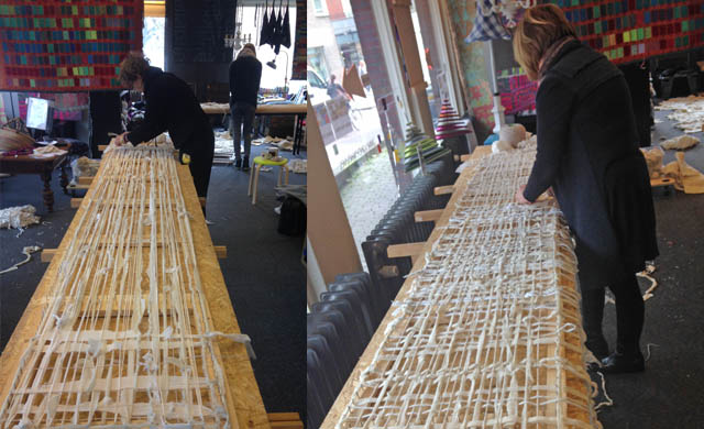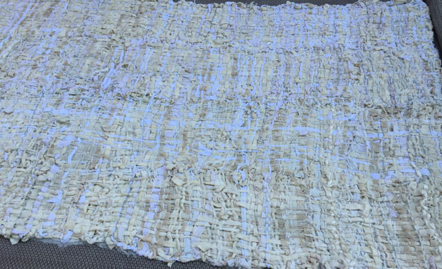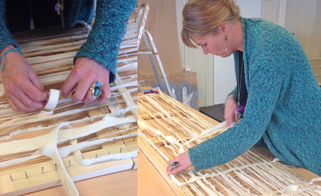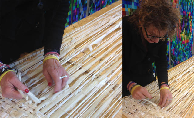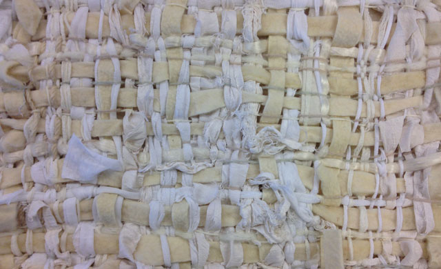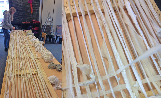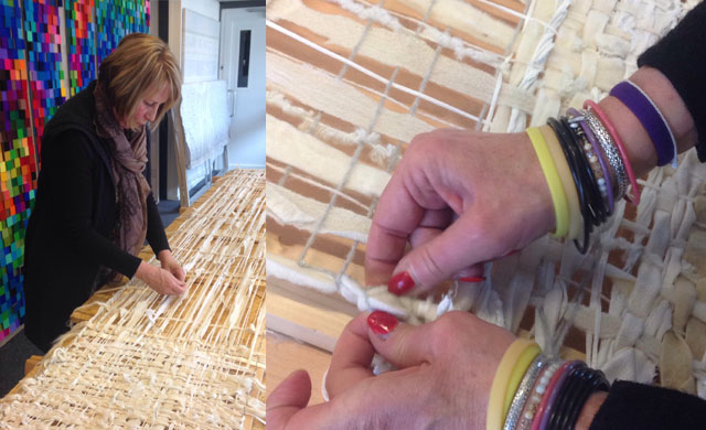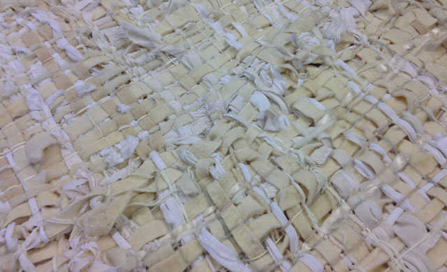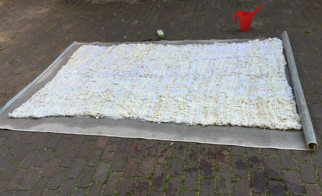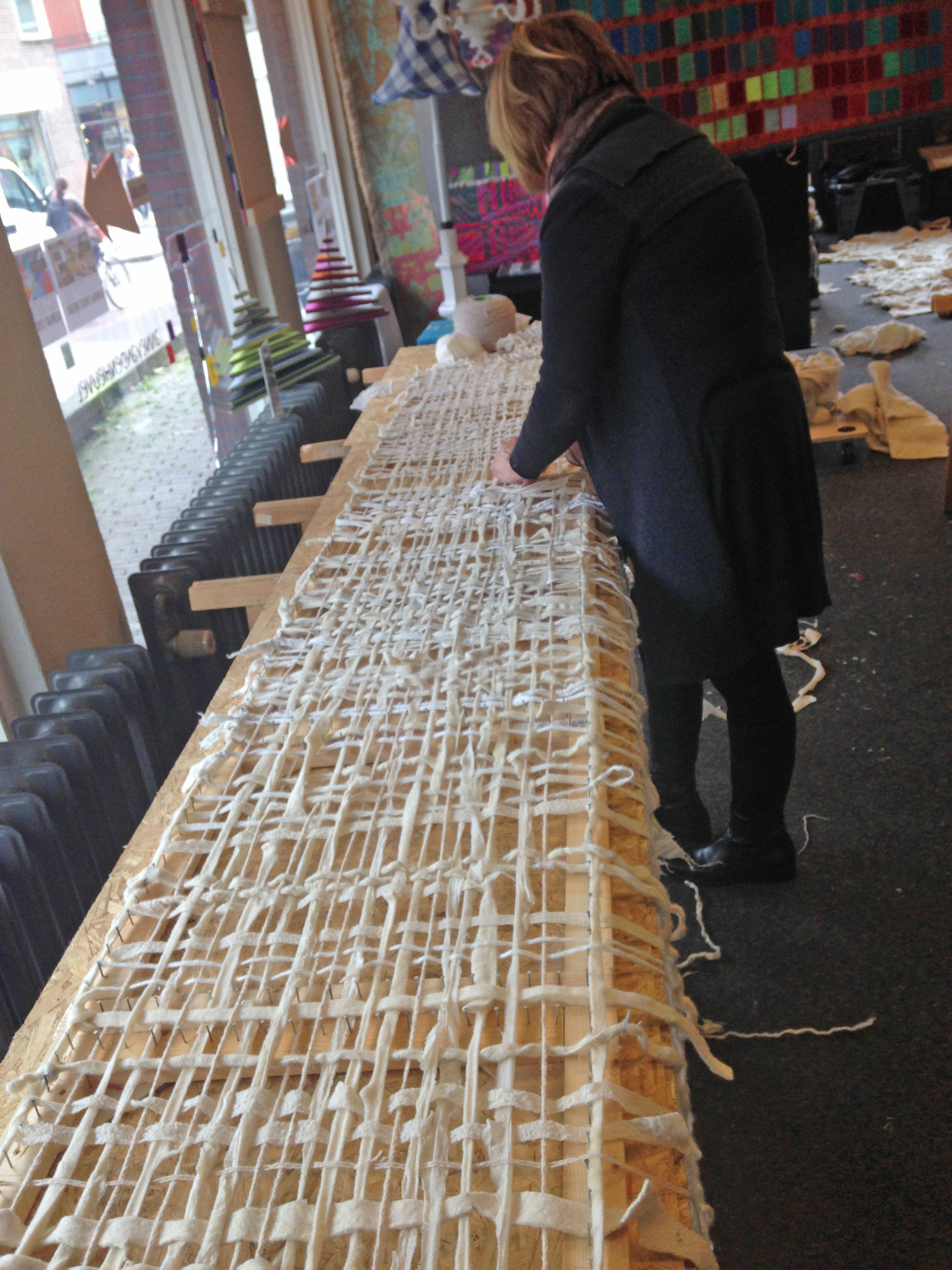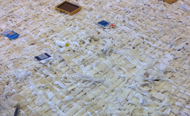 Na een aantal maanden, toen alle witte repen in elkaar verweven waren en met de hand gemonteerd op een wollen backing, was het project 2 bij 3 meter groot. Het was stevig maar nog los.