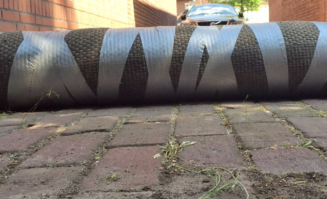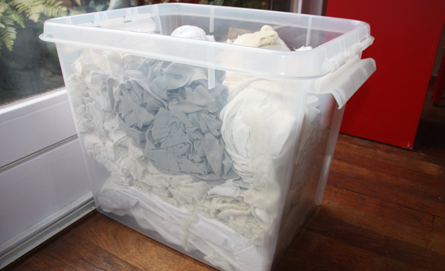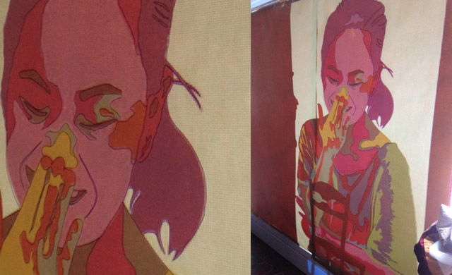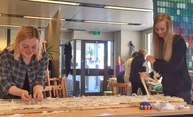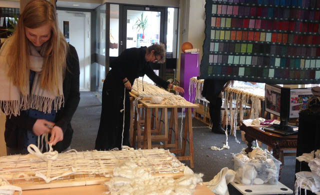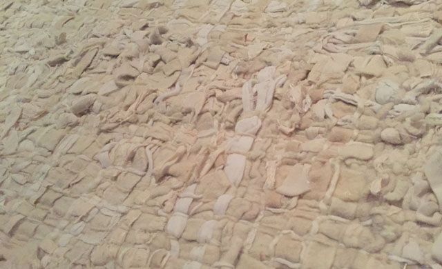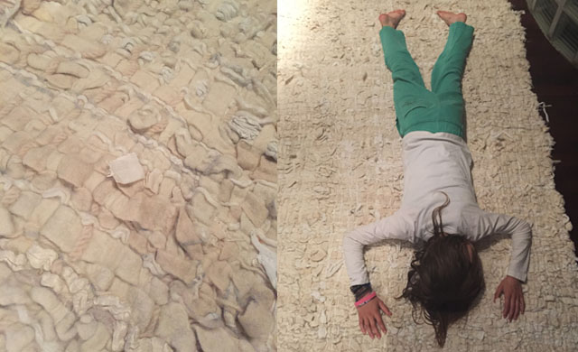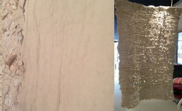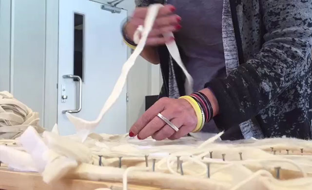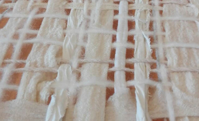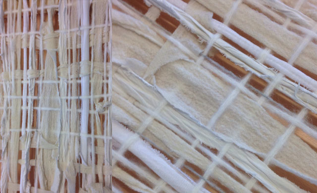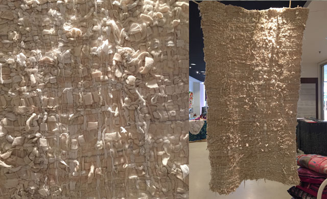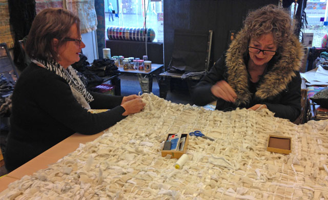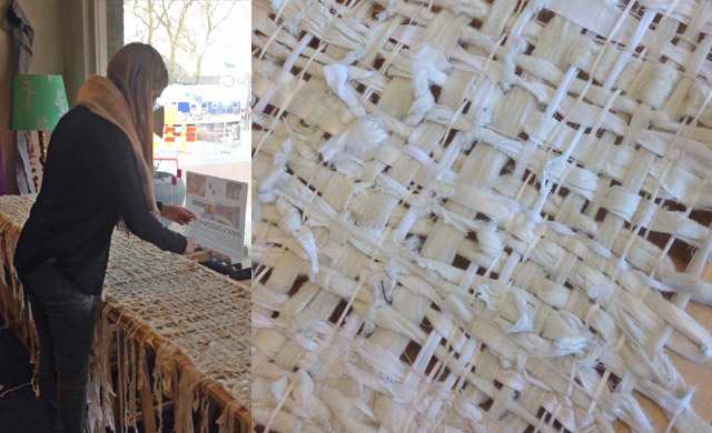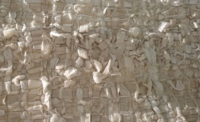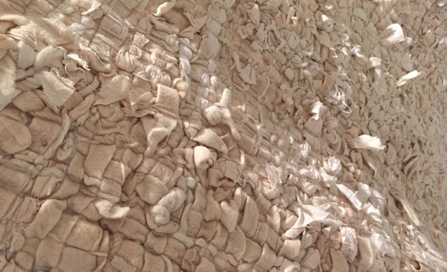 Na een aantal maanden, toen alle witte repen in elkaar verweven waren en met de hand gemonteerd op een wollen backing, was het project 2 bij 3 meter groot. Het was stevig maar nog los.