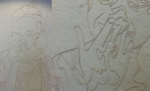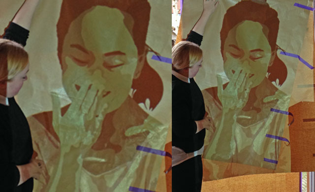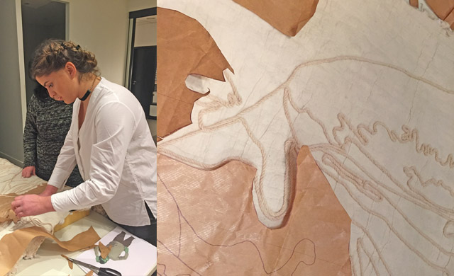 Nu werd het tijd om de patroontekening van YuHan uit te werken. Anne en haar stagiaires Linde, Marielle, Sanne, Anne, Lindsay en Tugce prikten een wollen draad in en op het weefsel en langzaamaan ontstond YuHan subtiel in ton-sur-ton.