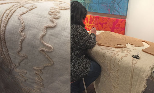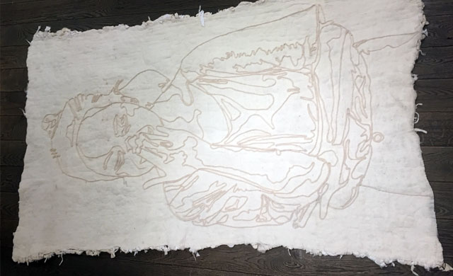 Door het vervilten krimpen de vezels in elkaar. Het uiteindelijke formaat van het kunstwerk is circa 1.50 bij zeker 2 meter geworden.