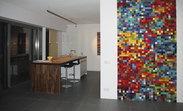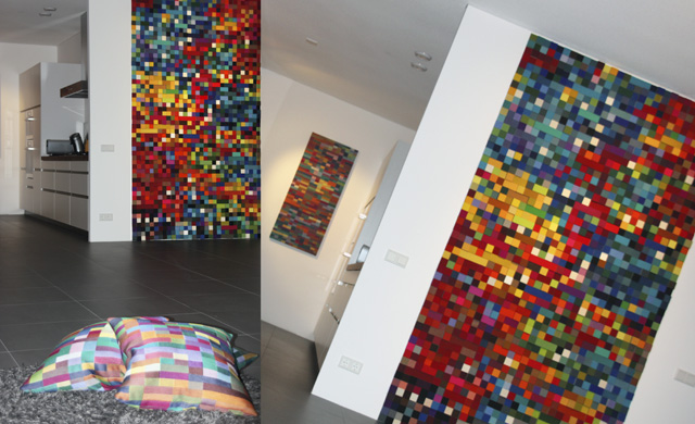 Acoustic Couture vormt vaak een logisch onderdeel passend binnen de architectuur. Ook op kleinere schaal voegt het werk van Anne toe aan sfeer, bijvoorbeeld met een serie kussens en een geweven kunstwerk speciaal gemaakt voor de dame en heer des huizes.