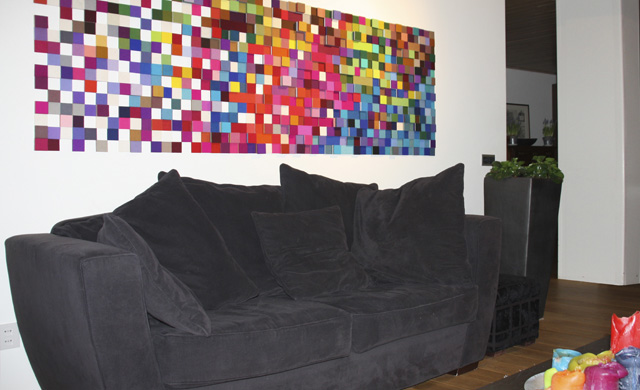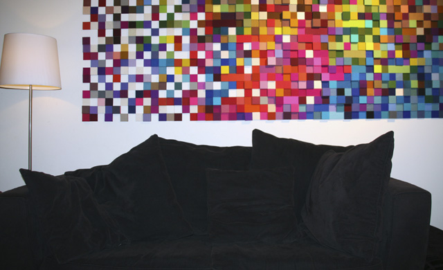 We genieten elke dag van de geweldige kleuren in ons huis! Met de uitloper met extra witte viltvierkantjes zijn we erg blij. We hebben twee weken geleden een mooie spot gekocht en die verlicht het kunstwerk precies goed. Alleen maar hele positieve reacties ... Dankjewel :-)
