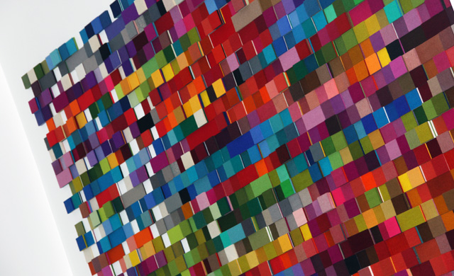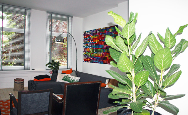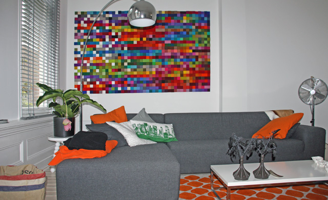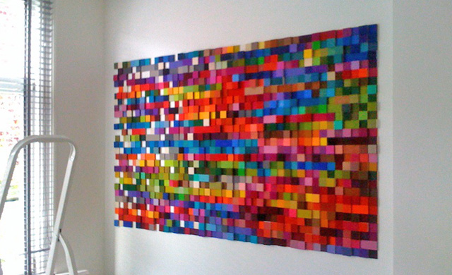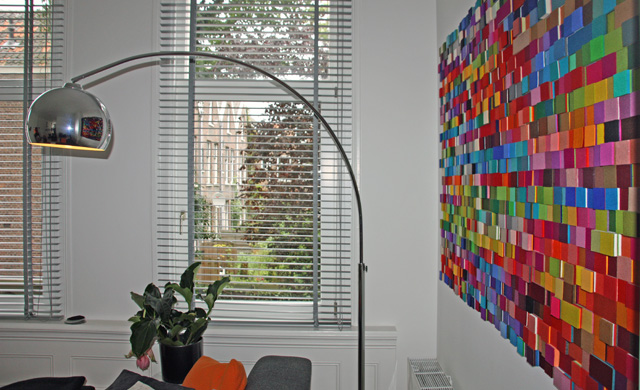 Per toeval vonden we de kleurrijke site van Anne en het ‘pakte’ ons direct. We waren al tijden op zoek naar een groot en kleurrijk kunstwerk voor aan onze grote witte muren. De totstandkoming van het werk was op zich al een leuk proces, waarbij we heel fijn hebben samengewerkt met Anne. Allereerst zijn we bij Anne thuis geweest, wat eigenlijk al een klein museum is, om te kijken naar de verschillende mogelijkheden. Daarna is Anne bij ons thuis geweest om op basis van de lichtinval en beschikbare muren de beste plek te adviseren. Erg handig voor de definitieve keuze waren de toegezonden foto’s van onze woning waarin het kunstwerk er al in gefotoshopt was. Het laatste stuk van het kunstwerk moet door Anne op locatie worden gedaan, erg leuk om dan een ruimte in een paar uur tijd compleet te zien veranderen. En nu het er eenmaal hangt zijn we heel blij. Het geeft ons huis een leuk en kleurrijk verrassingseffect. De zachtheid van het materiaal is een leuk contrast met onze hoge muren en open ruimte. We krijgen ontzettend veel enthousiaste reacties en bovenal zijn we zelf heel erg tevreden, trots en enthousiast!